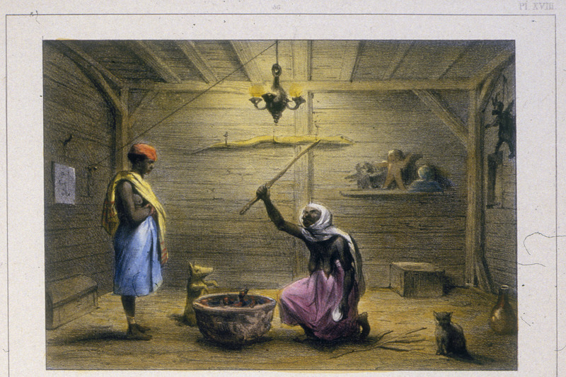 “The Mama-Snekie, or Water-Mama, Doing His Conjurations”, a female diviner using her spiritual powers to cure a child who is not present. Illustrated by Pierre Jacques Benoit (1782-1854) in Suriname, 1831.